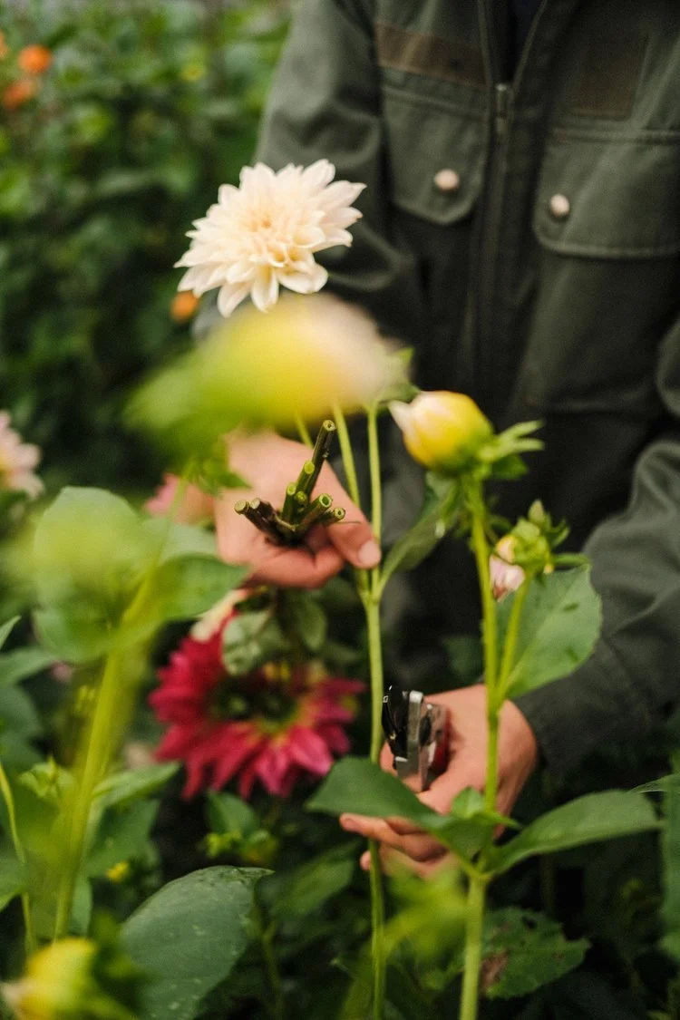 À l’époque, c’est la saison des dahlias ; dont les couleurs flamboyantes recouvrent la quasi-totalité de sa parcelle. Elle s’épanouissent en plein air, sont cultivés sans produits chimiques, et récoltées à la main avec grand soin.
