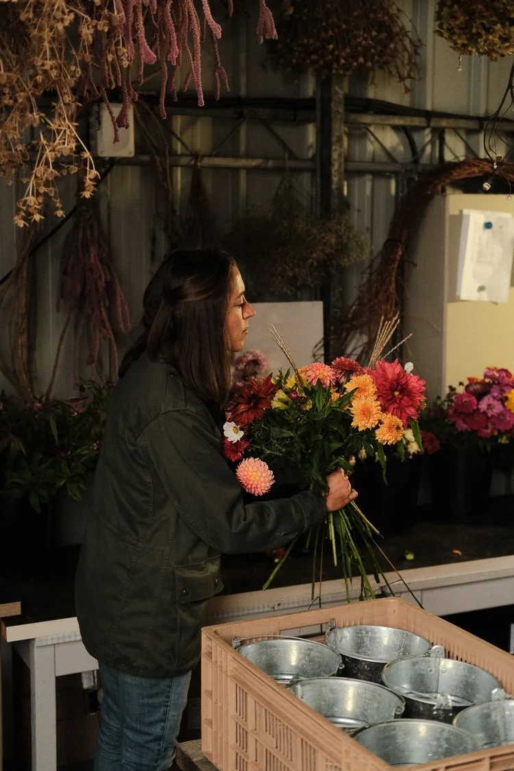 À l’époque, c’est la saison des dahlias ; dont les couleurs flamboyantes recouvrent la quasi-totalité de sa parcelle. Elle s’épanouissent en plein air, sont cultivés sans produits chimiques, et récoltées à la main avec grand soin.